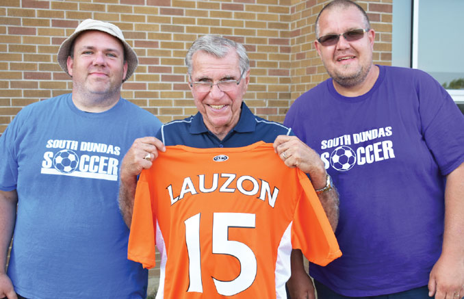 At the end of the opening ceremonies for the South Dundas Soccer World Cup tournament, members of the SDSA board presented retiring Stormont-Dundas-South Glengarry member of Parliament Guy Lauzon with his own SDSA jersey. Since 2004, Lauzon has officially opened the tournament.