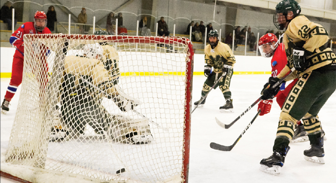 South Grenville Rangers forward Cameron Dillon (#21, left) shot through the five-hole for the go-ahead, power play goal early in the third period of the November 9th game against the Metcalfe Jets. The goal was Dillon’s fifth of the season. The Rangers continue to lead the NCJHL with 11 wins this season. (The Leader/Blancher photo)