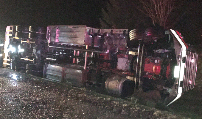 jan1-tankerrollover South Dundas Fire and Emergency Services tanker #143 lays on its side in the ditch while responding to a fire on Irena Road December 30th. – SDFES media release photo. Like this:Like Loading...