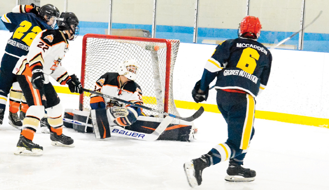 Morrisburg Lions defenceman Kayne McCadden (right, #6) fired this shot which was blocked by West Carleton Inferno goalie Nathan Cheung during the teams’ game on January 26th. After leading 2-1 in the first period, the Lions gave up the lead in the second period, and tied the game early in the third period. The Inferno broke through the Lions defence in the third period resulting in an 8-5 loss for the Lions, the team’s 24th of the season. – Leader photo
