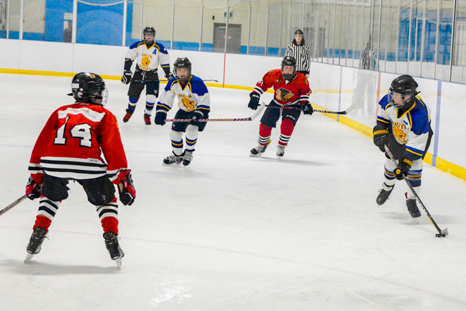 mar4-peeweebreyenvanbeilen Lions’ alternate captain Reyen Vanbeilen (right) moves the puck up-ice in the second period of game three of the playoff quarterfinal series between the Lions and the Braves.
