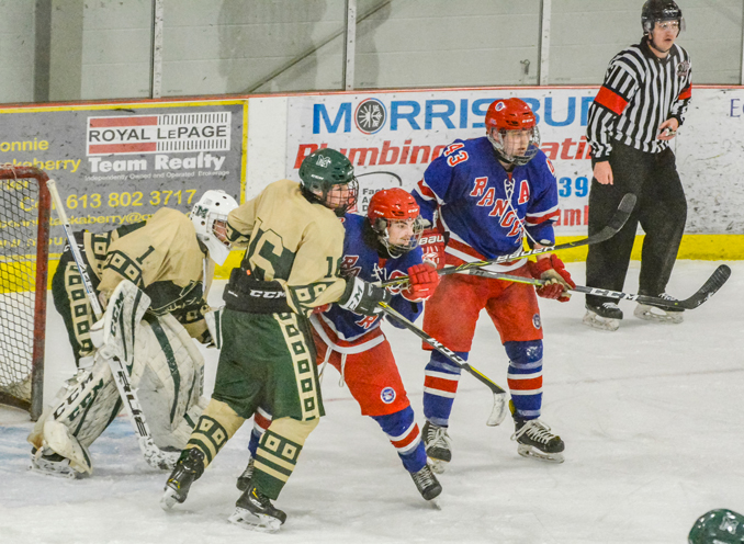 South Grenville Rangers forwards Brody Ranger (center, #61) and Jordan Dodge (right, #43) combined for 15 points in the first round playoff series against the Metcalfe Jets. The Rangers outscored the Jets 28-4 in the series sweep. – Leader photo