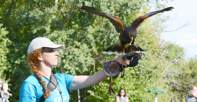 Animal handler Shawna Sevigny from Falcon Environmental Services with Phoenix, a Harris Hawk, were part of the Friends of the Sanctuary’s annual Nature and Wildlife Day at the Upper Canada Migratory Bird Sanctuary in September 2018. The UCMBS has been closed since the beginning of the COVID-19 pandemic due to damage to trails and a boardwalk according to the St. Lawrence Parks Commission. (The Leader/Blancher photo)