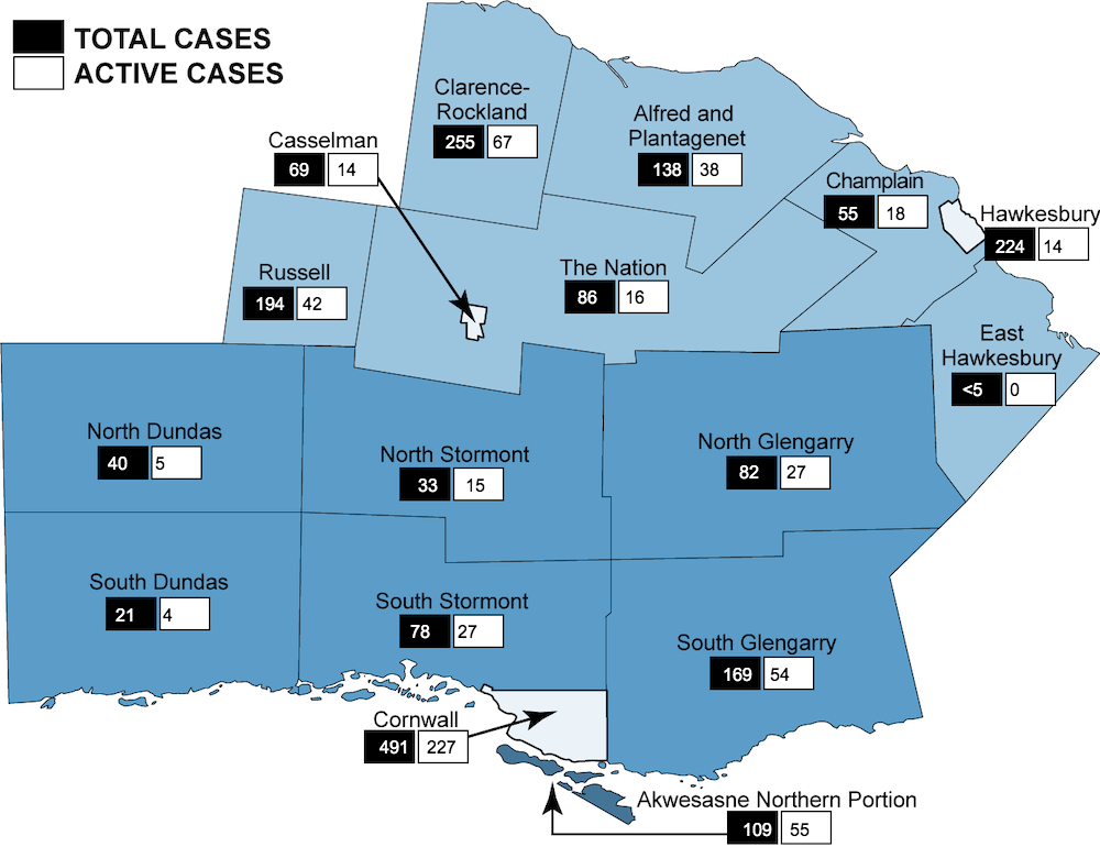 Locally, there have been 21 cases in South Dundas, but only four cases are active. North Dundas has had 40 cases overall, five of which are active.