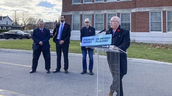 Minister of Municipal Affairs and Housing Steve Clark announces nearly $1.7 million in funding for an affordable housing expansion at Morris Glen in Morrisburg November 10. Pictured in the background are South Dundas Mayor-elect Jason Broad, Stormont-Dundas-South Glengarry MPP Nolan Quinn, and South Dundas Mayor Steven Byvelds. (The Leader/Comfort photo)
