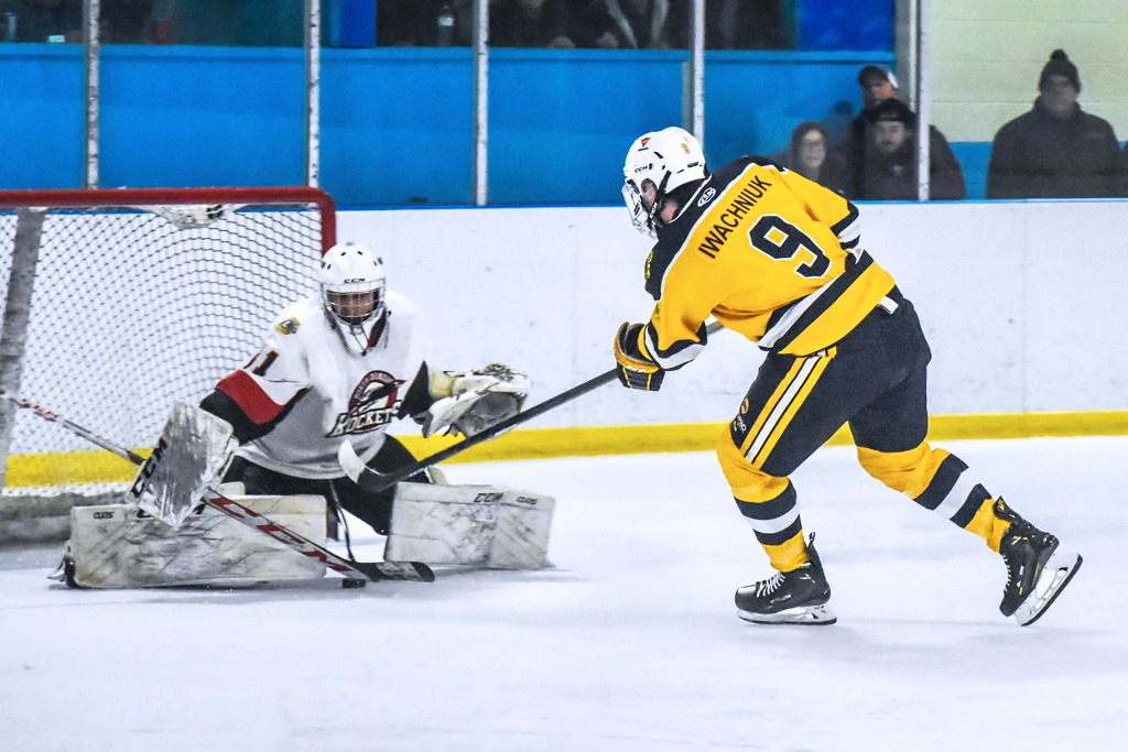 Shorthanded? No problem! Morrisburg Lions’ forward Rylan Iwachniuk (#9 right) shot low, and through the five hole on North Dundas Rockets goalie Jason Van Wieren, scoring a definitive short-handed goal in the second period of Tuesday night’s playoff series opener. (The Leader/Blancher photo)