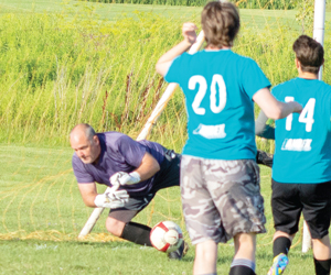 The Pink Panthers faced their toughest challenge so far the season when they met the Unathleticos on the soccer pitch July 18 in the SDUFC Adult Super League. The two teams played a spirited first half with Panthers’ right wing-back Shayne Ingram scoring the lone goal of the game late in the first half. A play in midfield found Adamo Siviero collect the ball, passing it on the right to Ingram, who found his way past Unathleticos’ goalkeeper Scott Runions. Panthers led 1-0 at half time. Several plays in the second half saw both Runions, and Panthers’ goalkeeper Hunter Jones each make key saves for their team. At full time the score remained 1-0. In the other match of the night, Purple Haze collected their first win of the ASL season, 5-2 over the Seaway Snipers. Gavin Uhr scored a hat trick in the match. Pictured above, shot-stopper Runions (centre) goes to ground to save a shot attempt by Ingram early in the first half. (SDUFC photo)