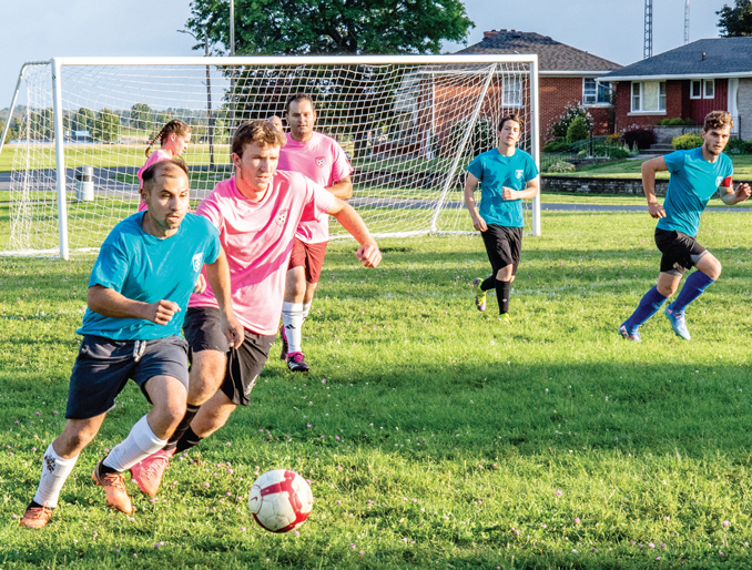 Unathleticos’ midfielder Anthony Paparo starts a run up the wing with Pink Panthers’ midfielder Theo Blancher in pursuit during their championship match on August 22. The Pink Panthers defeated Unathleticos 3-1. (Supplied SDUFC photos)