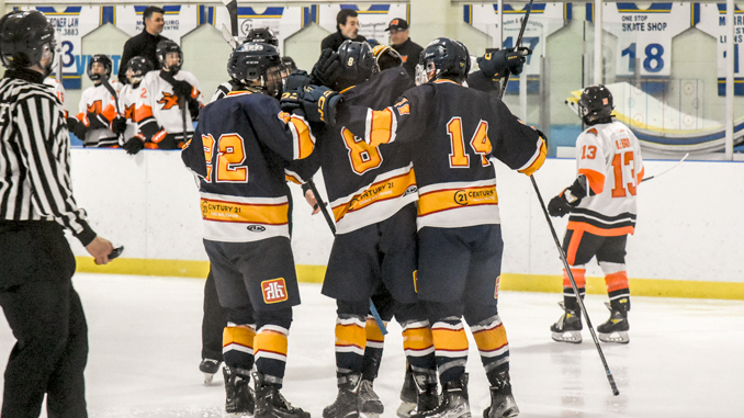 South Grenville scored a power-play goal to tie the game early in the third. That tie game lasted all of six minutes before Cyr (Elliott, Lapier) scored on a Lions’ power-play to restore the one goal lead. Elliott (Rozon, Lapier) and Kahotiio Lazore (Elliott, Lapier) added two more power-play goals late in the period. A breakaway unassisted goal from Broad sealed the Lions’ 5-1 win. Four points down, two more to go.