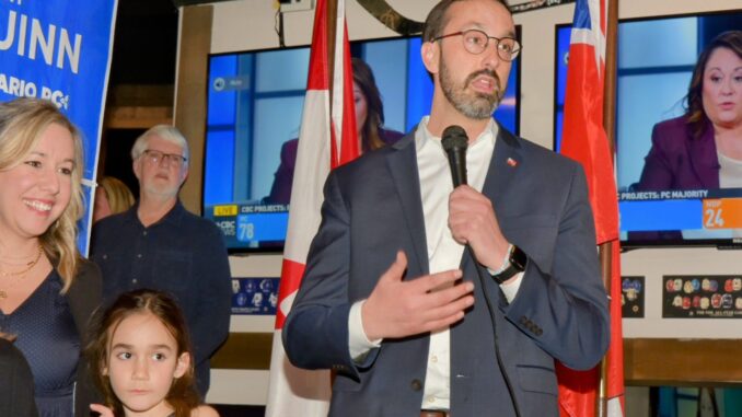 CORNWALL – Incumbent MPP Nolan Quinn has been re-elected. Quinn, who was first elected MPP in June 2022, took 62 per cent of the vote Thursday night (February 27). Quinn will be part of an expanded Doug Ford government. Ford won his third consecutive majority government, taking 80 of 124 seats. This is a one seat increase. The PC Party of Ontario held 79 seats at dissolution.