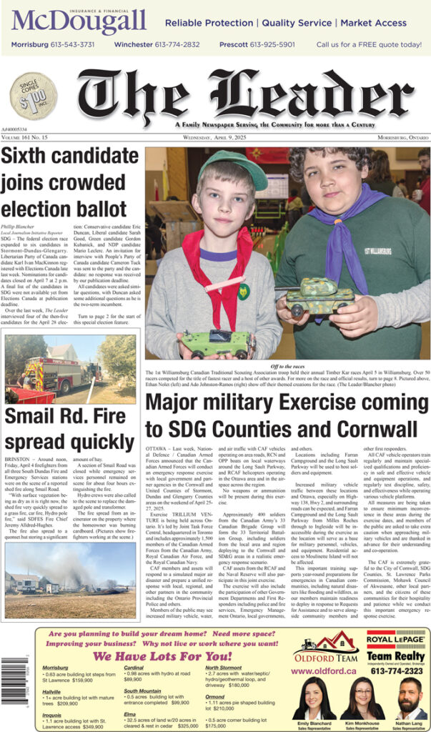 OTTAWA – Last week, National Defence / Canadian Armed Forces announced that the Canadian Armed Forces will conduct an emergency response exercise with local government and partner agencies in the Cornwall and United Counties of Stormont, Dundas and Glengarry Counties areas on the weekend of April 25-27, 2025.