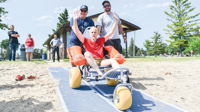 jul2-beach1 Mayor Jason Broad and Councillor Cole Veinotte provided a helping hand to roll the Mobi-chair into the river along the new access mat as South Dundas Recreation and Community Living officials looked on. (The Leader/Blancher photo) Like this:Like Loading...