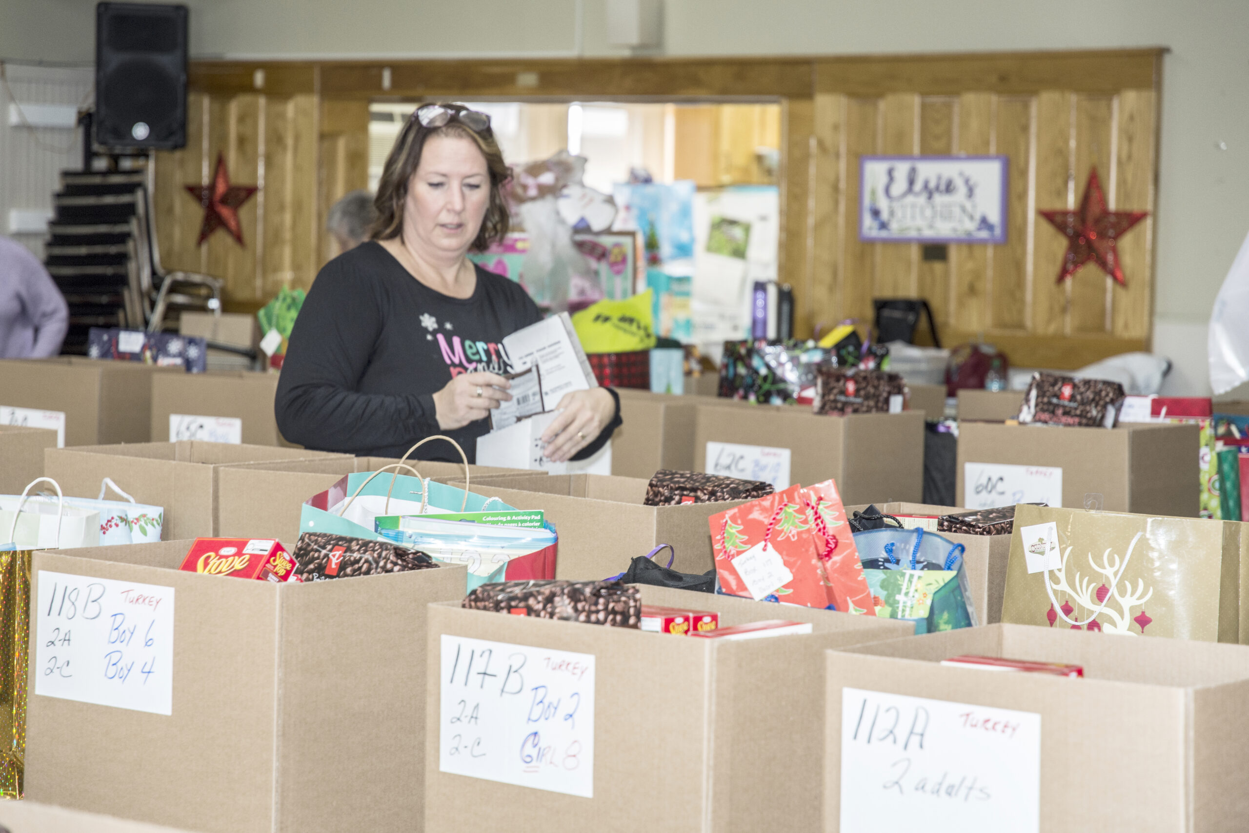 dec24-sdcefp Cassandra Gurnhill Barry adds food items to the family boxes during the organization’s packing day on December 16. (The Leader/Blancher photo)