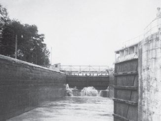 This photo, courtesy of the Lost Villages Historical Society archives, shows a water level view entering Lock 25, going west, at Iroquois. The eastern entrance of the Galop Canal, this lock was originally built in […]